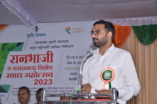 मराठवाडा मुक्ती संग्राम अमृत महोत्सवी वर्षानिमित्त जिल्हाधिकारी कार्यालयाच्या परिसरात “ रानभाजी व मराठवाडा विशेष खाद्य महोत्सवाचे” 19 व 20 ऑक्टोबर 2023 या दोन दिवशीय महोत्सवाचे आयोजन केले आहे. या महोत्सवात जिल्हयातील शेतकरी गट व महिला गटांचा सक्रिय सहभाग आहे. या महोत्सवात विक्रीच्या ठिकाणी जिल्हयात उपलब्ध होणाऱ्या सर्व रानभाज्याचा समावेश आहे. यात शेतकऱ्यांनी विविध उत्पादीत केलेला भाजीपाला, सेंद्रीय उत्पादने, फळे, गुळ, हळद, लाकडी घाण्याचे करडीचे तेल, मध, धान्य, विविध डाळी व केळीचे वेफर्स विक्रीसाठी उपलब्ध आहेत. यावेळी जिल्हाधिकारी अभिजीत राऊत यांनी रानभाजी व सेंद्रीय पध्दतीने पिकविलेल्या उत्पादनाच्या स्टॉलला भेट देवून पाहणी केली.