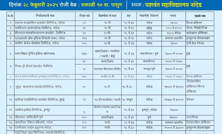 या रोजगार मेळाव्यामध्ये नामांकित उद्योजक व इतर आस्थापनांच्यावतीने मुलाखती घेण्यात येणार आहेत. तरी जिल्ह्यातील बेरोजगार उमेदवारांनी शुक्रवार 28 फेब्रुवारी 2025 रोजी सकाळी 10 वा. यशवंत महाविद्यालय, बाबानगर, नांदेड येथे उपस्थित राहून या संधीचा लाभ घ्यावा, असे आवाहन जिल्हा कौशल्य विकास, रोजगार व उद्योजकता मार्गदर्शन केंद्राच्या सहायक आयुक्त रेणुका तम्मलवार यांनी केले आहे.