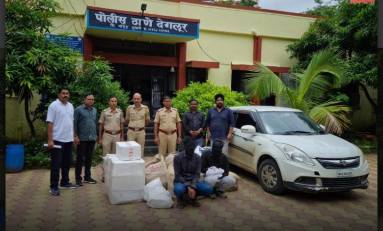 या कारवाईत शेख साजीद शेख जलाल बागवान (वय ३८) व शेख अख्तर शेख गफार बागवान (दोघेही रा. सदर बाजार, जामा मस्जिद जवळ, हिंगोली) या दोन आरोपींना अटक करण्यात आली. हे दोघे पांढऱ्यारंगाच्या स्विफ्ट डिझायर (ΜΗ १२ KN ६०३९) कारमधून प्रतिबंधित सुगंधी तंबाखू आणि गुटख्याची वाहतूक करत असल्याची माहिती देगलूर पोलिसांना मिळाली होती. त्यानुसार पोलिसांनी वझरगा येथे सापळा रचून संबंधित कार अडवून तपासणी केली असता मोठ्या प्रमाणावर प्रतिबंधित माल आढळून आला.