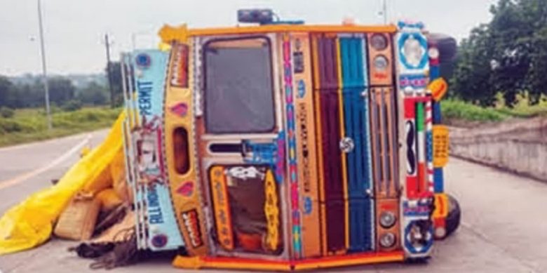 तांदळाच्या ६२० गोण्या घेऊन जाणारा ट्रक फुलवळ टोलनाक्याजवळ उलटला