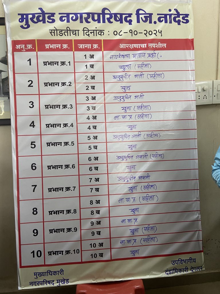 मुखेड नगरपरिषदेच्या १० प्रभागातील २० जागांसाठी आरक्षण जाहीर